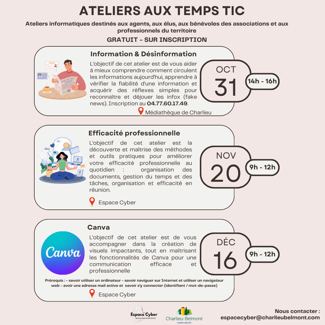 L’Espace Cyber vous propose son nouveau cycle d’ateliers numériques gratuits dans le cadre du programme Aux Temps TIC.